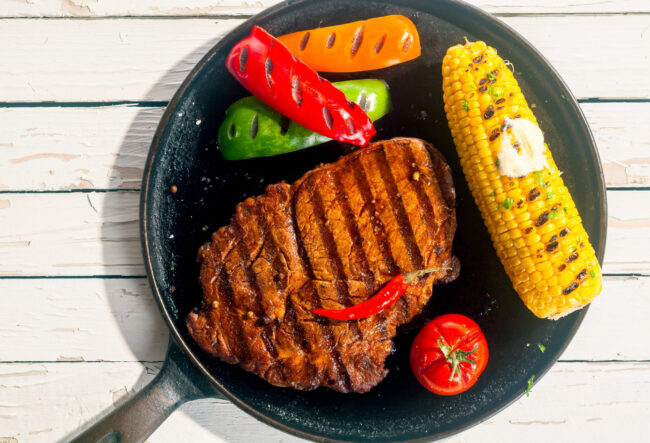 Grilled Rib-Eye steaks with grilled corn and roast potatoes